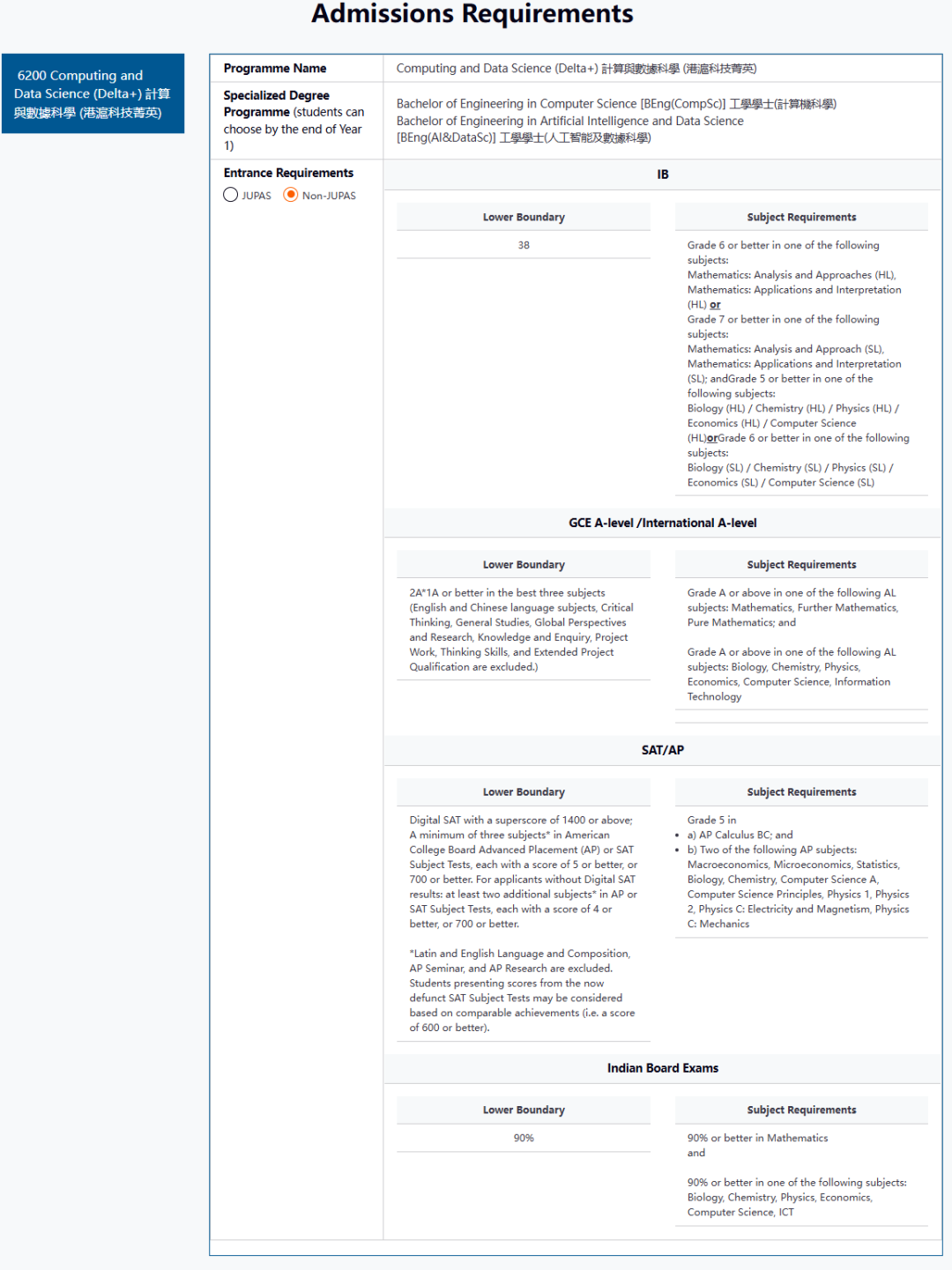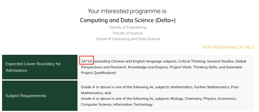 数学、进阶数学或纯数学中的一科AL*需达到A或以上; 生物、化学、物理、经济、计算机科学或信息技术中的一科AL*需达到 A 或以上。
