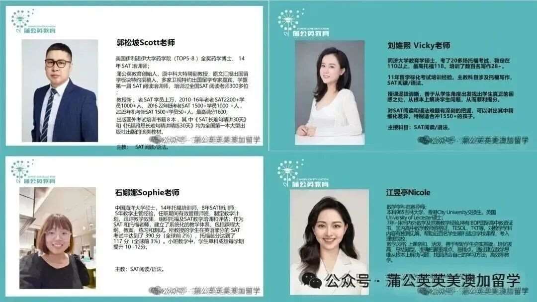 蒲公英教育 SAT 教学团队,汇聚行业卓越师资力量 —— 授课教师人均教龄超 10 年,兼具深厚专业功底与丰富教学经验。