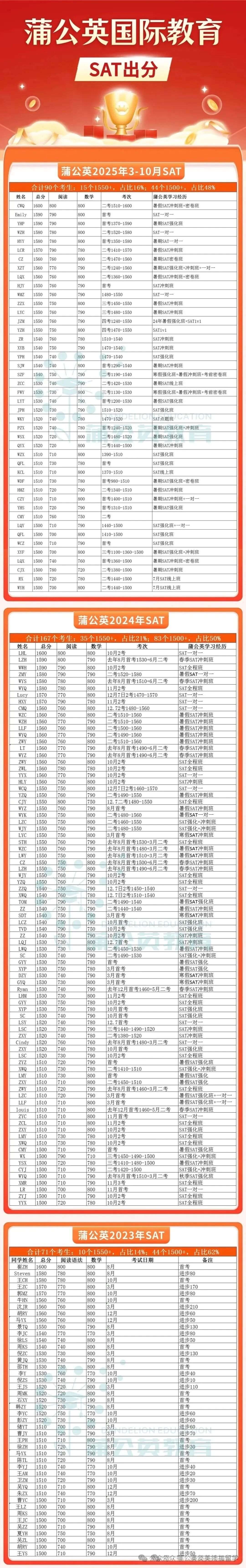 在2025年9月SAT考试中,9月蒲公英SAT学员:SAT出分【1550】,上外金同学从1510-1550;SAT出分【1540】,七德沈同学从1380-1540进步160分;SAT出分【1530】,天一冯同学考前短冲班从1380-1530......