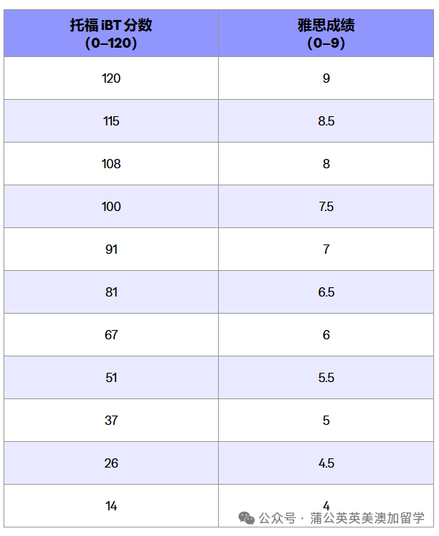 左侧栏为雅思分数等级,右侧栏对应托福*区间:如官方标注雅思 6.0 分对应托福 67-80 分,雅思 5.5 分对应托福 51-66 分。