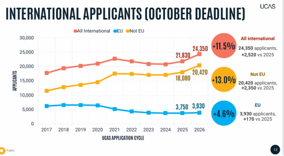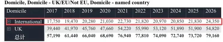 数据背后是结构的巨变:脱欧后欧盟生源一度断崖式下跌,今年小幅回暖至3,930人;而非欧盟生源持续强劲增长,今年达20,420人,同比增长12.9%,成为主力。