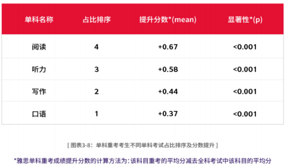 阅读成为幅度*大的科目,重考后平均提升0.67分,是考生短期内突破总分瓶颈的优选策略。 口语则为报名比例*高的重考科目,反映出考生在克服“口语短板”的同时,也越来越重视实际沟通能力的提升。