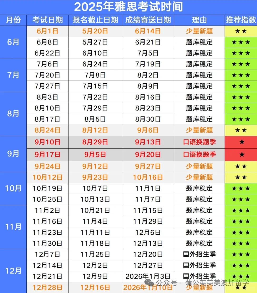 📌 建议:用「考试时间倒推法」制定计划 —— 若目标 2025 年 9 月入学,最晚需在 6 月前完成首考,预留 2-3 次刷分空间。关注蒲公英英美澳加留学公众号,获取实时考位动态,避开报考坑!