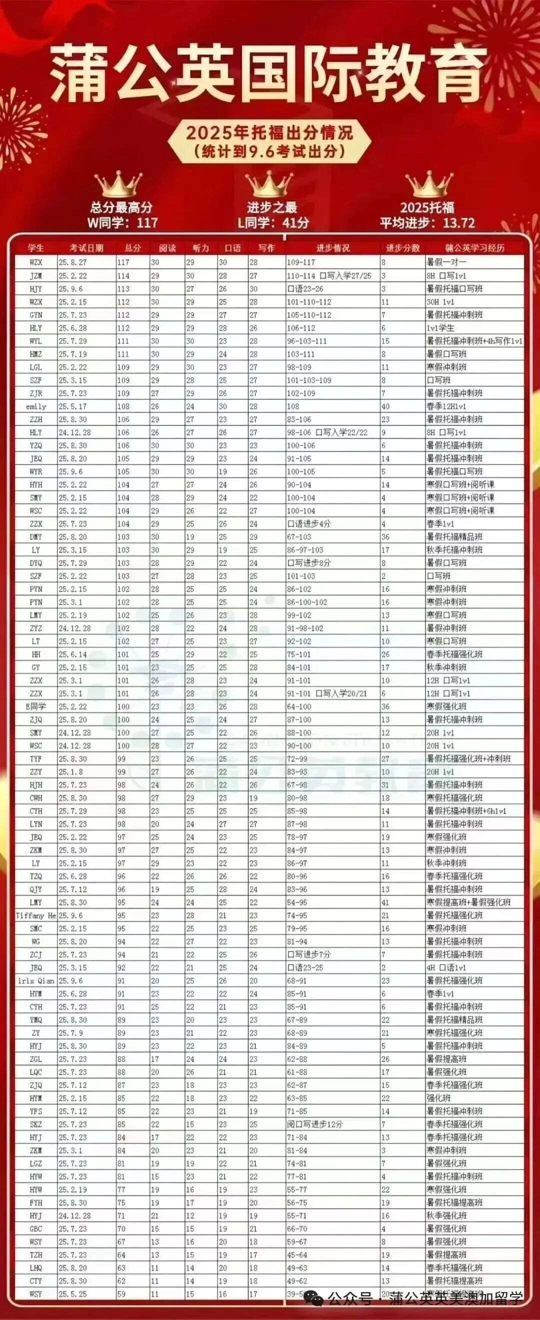 上海蒲公英国际教育出分:托福一个全程班平均进步10-15分。去年寒假21个托福100+的孩子,口语25+的8个,占比30%+; 写作15个25+,占比70%。