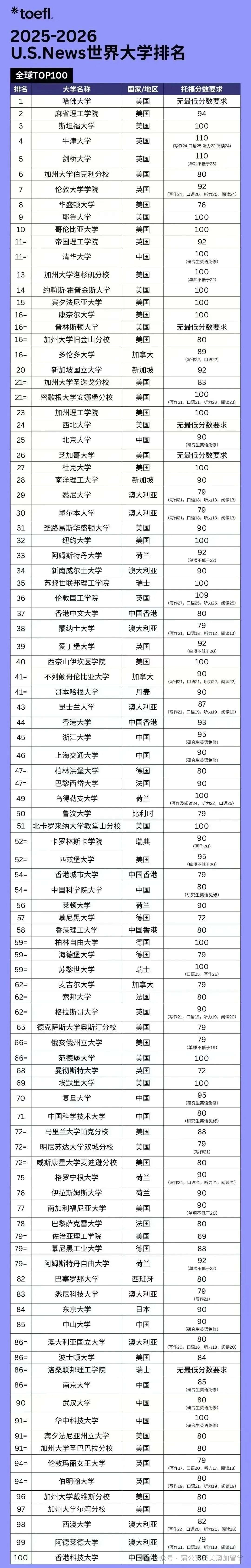 以下是关于“托福多少分算通过?托福考试80分什么水平?托福不同分数段水平解读&USNews100要求一览表!”的相关内容: