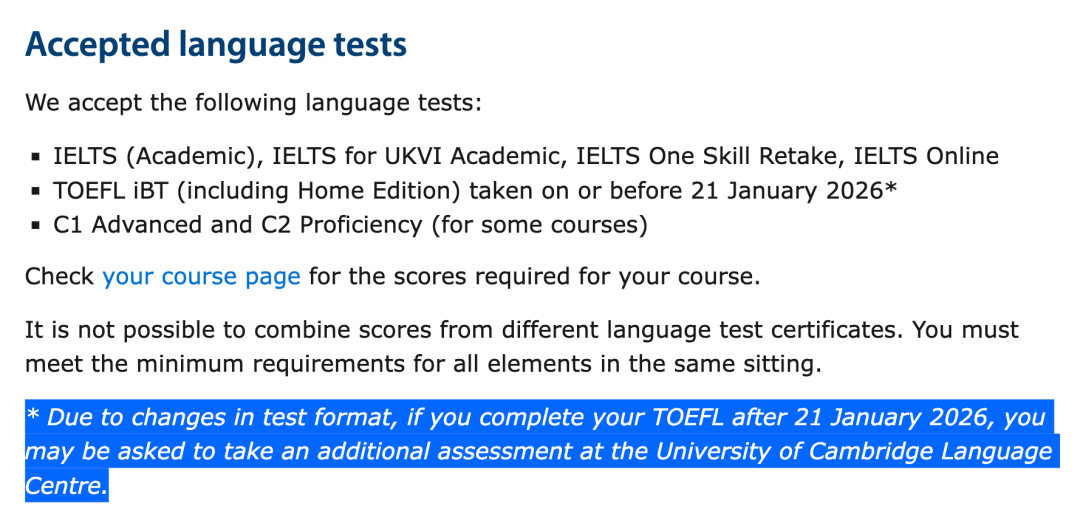 这意味着,剑桥对新托福并非“完全拒之门外”,但附加测试的要求无疑增加了申请不确定性。更关键的是,剑桥本科申请政策暂无松动,官网仍标注2026年1月后的新托福无法满足入学要求。