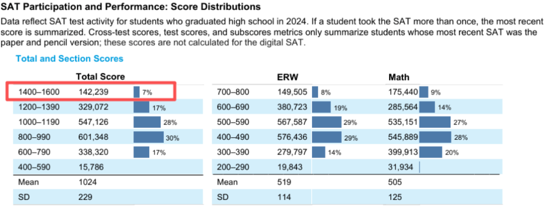 1550+到底有多难?SAT1550分什么水平?SAT满分1600分,1550这个分数意味着考生已跻身全球行列,在语言、数学逻辑和阅读理解上具备超强实力,也印证了美国学校看重的学术潜力。而根据 College Board 2024 年 SAT 官方报告,仅有 7% 的学生能考到 1400-1600 分数段,1550 + 更是凤毛麟角!