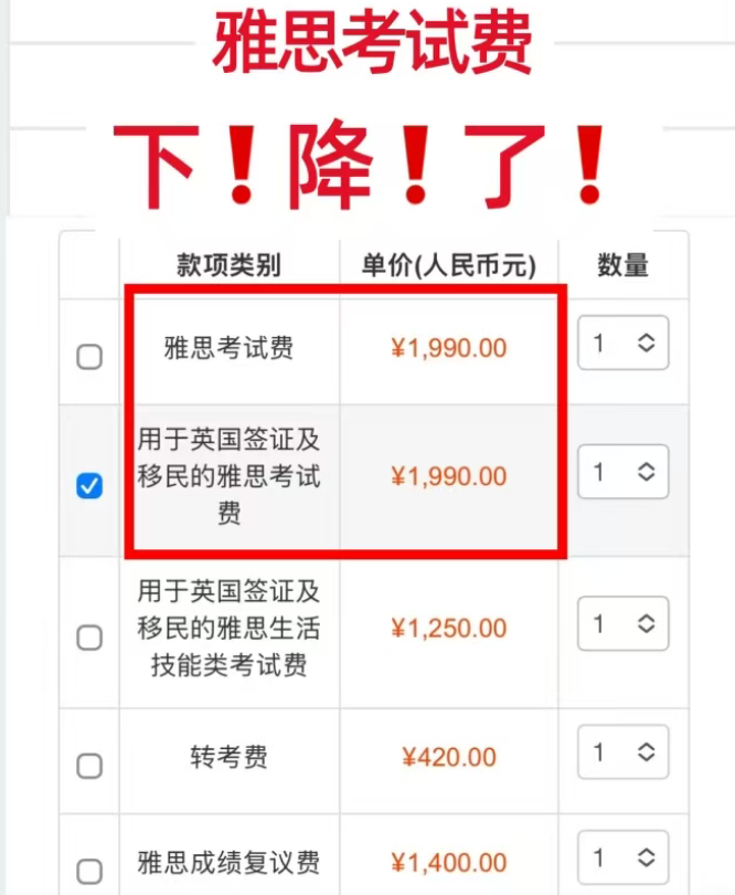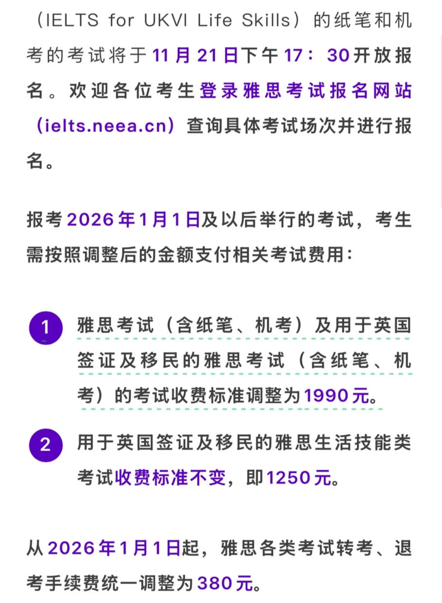 ③从2026年1月1日起,雅思各类考试转考、退考手续费统一调整为380元。
