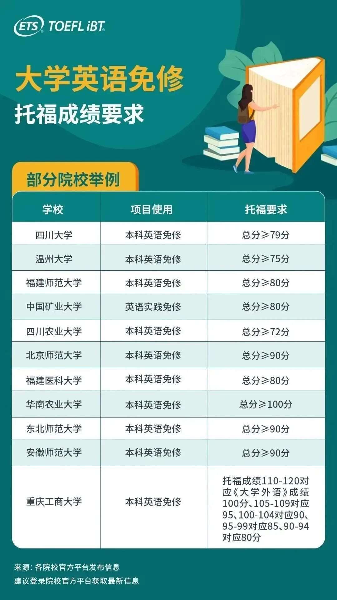 持有托福*,可在大学期间申请免修一门或多门公共英语课程,具体详见下图。