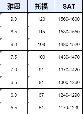 涉及雅思托福SAT分数换算先来看下最新的雅思托福分数对照表: