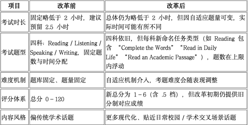 自适应考试模式上线:考试过程中,系统将根据考生答题表现实时调整题目难度与题量,题量不再固定,更能精准匹配考生真实水平。 题材贴近现实与高校生活:打破传统 “学术讲义” 局限,扩展至 “日常场景 + 现代校园情境”,更侧重语言实际应用能力考查。 评分体系全面更新:原 0–120 分总分体系,升级为 1–6 分(含半分档)评分模式,四科分别独立评分后取平均值(四舍五入至 0.5 分)。 两年过渡期保障:改革生效后约两年内,考生将同时获得新旧分制(0–120 分)对应的 “可比分数”,确保院校申请无缝衔接。