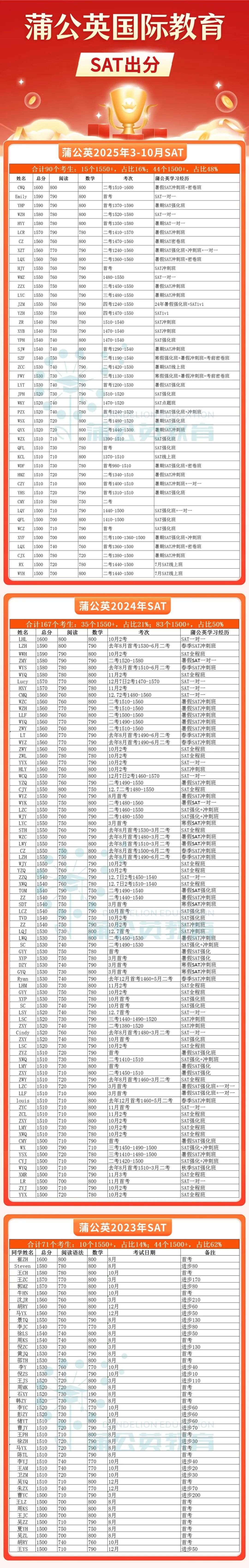 一般经过我们蒲公英一期的培训,80%以上就能考到SAT1500。以后随着SAT的变难,要求还会更高。