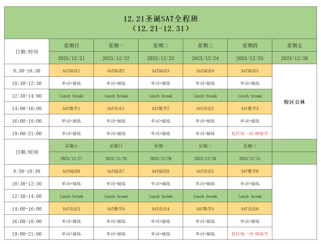 圣诞假期堪称全年第二长黄金备考窗口!足足2-3周的连续假期,远超周末零碎时间。国际生彻底告别校内课业、考试、课外活动的多重挤压,再也不用在 “赶学校 ddl” 和 “刷标化真题” 之间反复拉扯。沉浸式备考模式直接拉满,轻松养成学习惯性,效率翻倍不是梦!