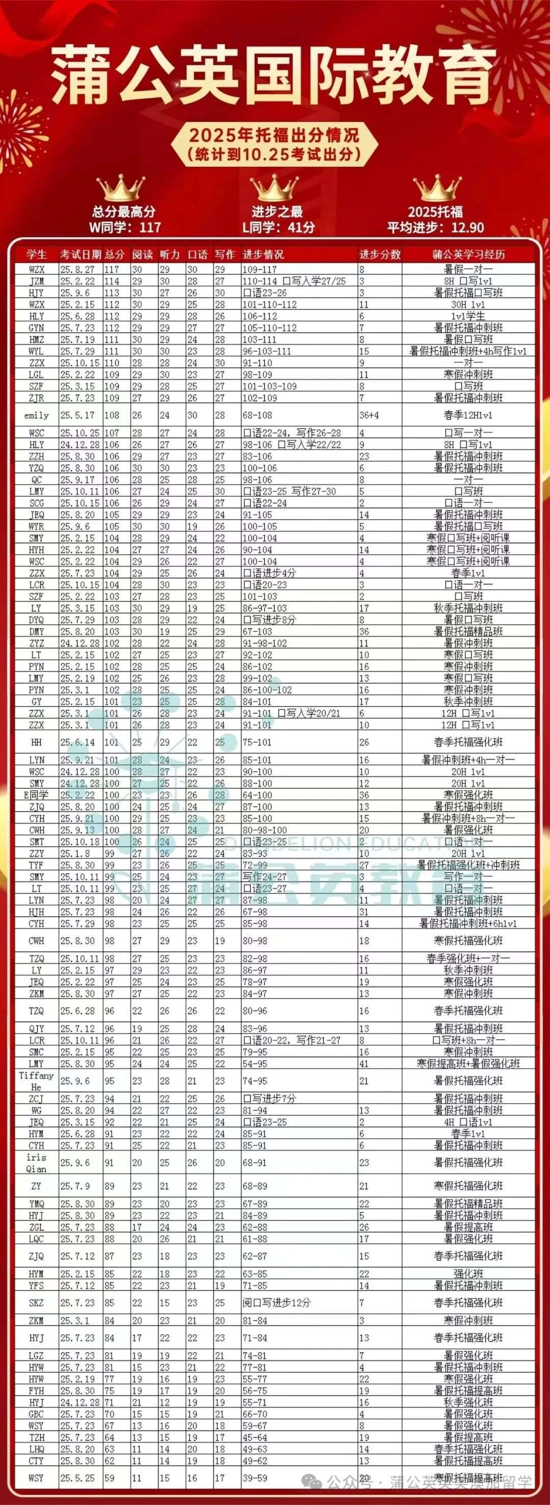 蒲公英托福一个全程班平均进步10-15分。去年寒假21个托福100+的孩子,口语25+的8个,占比30%+; 写作15个25+,占比70%。