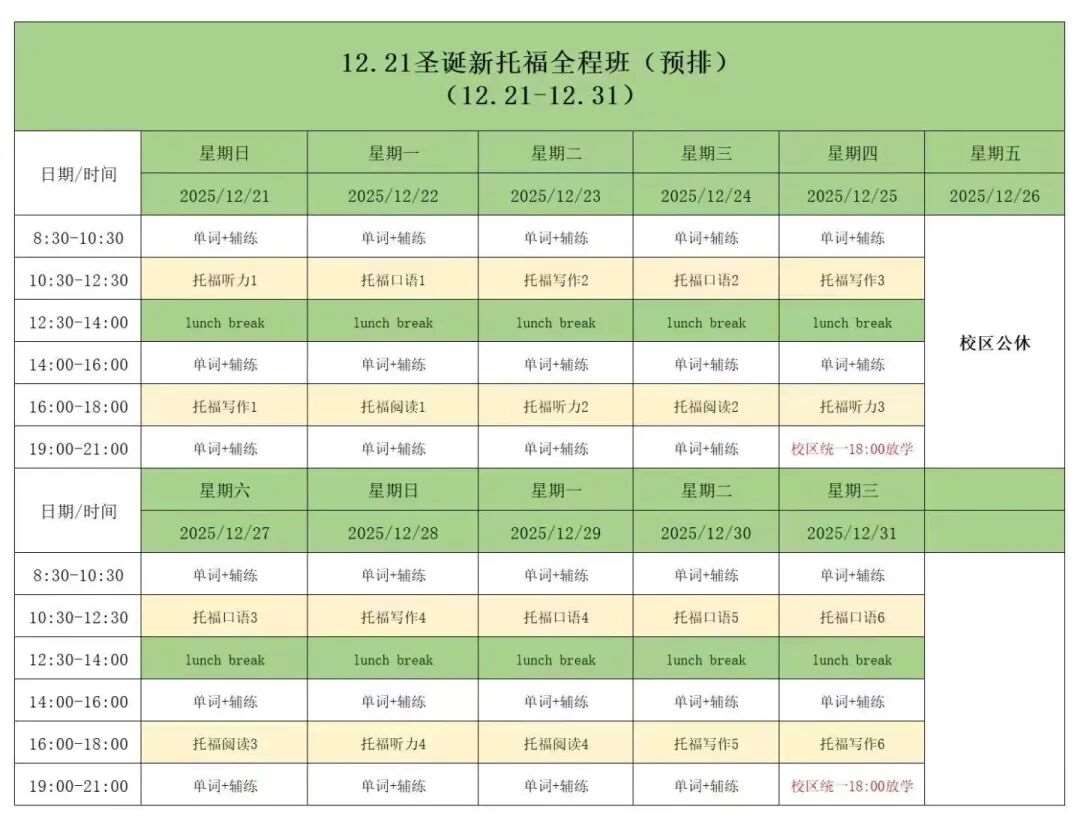 蒲公英圣诞新托福目前空出一人席位!新托福改革线下小班集训课程课表已出,欢迎各位同学和家长提前规划、预约测试诊断及报名。☝🏻新托福改革线下小班集训课程☝🏻