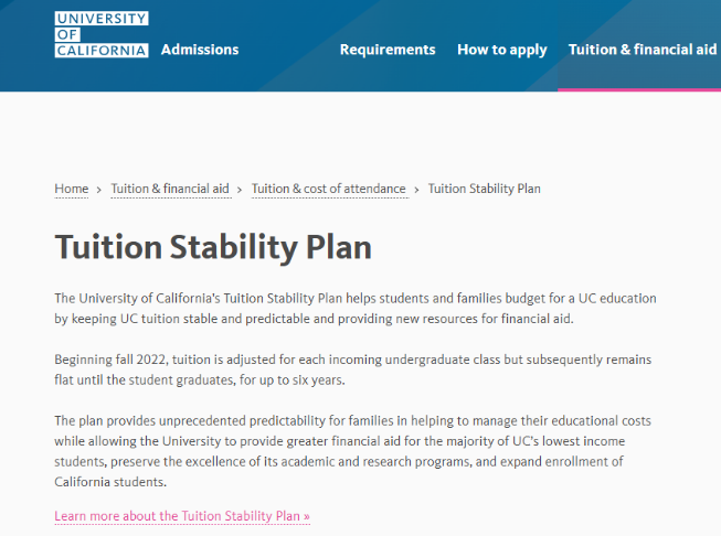 所谓 “学费稳定计划”,又称 “届别学费”,在加州大学(UC)系统内并非全策。该政策于 2021 年由校董会审议通过,2022 年正式启动实施。