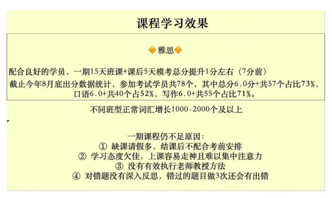 拒绝焦虑,科学评估出分时长:在雅思7分之前,雅思每进步一分大概需要150小时。经过一个班200小时的培训,雅思一个班进步1-1.5分