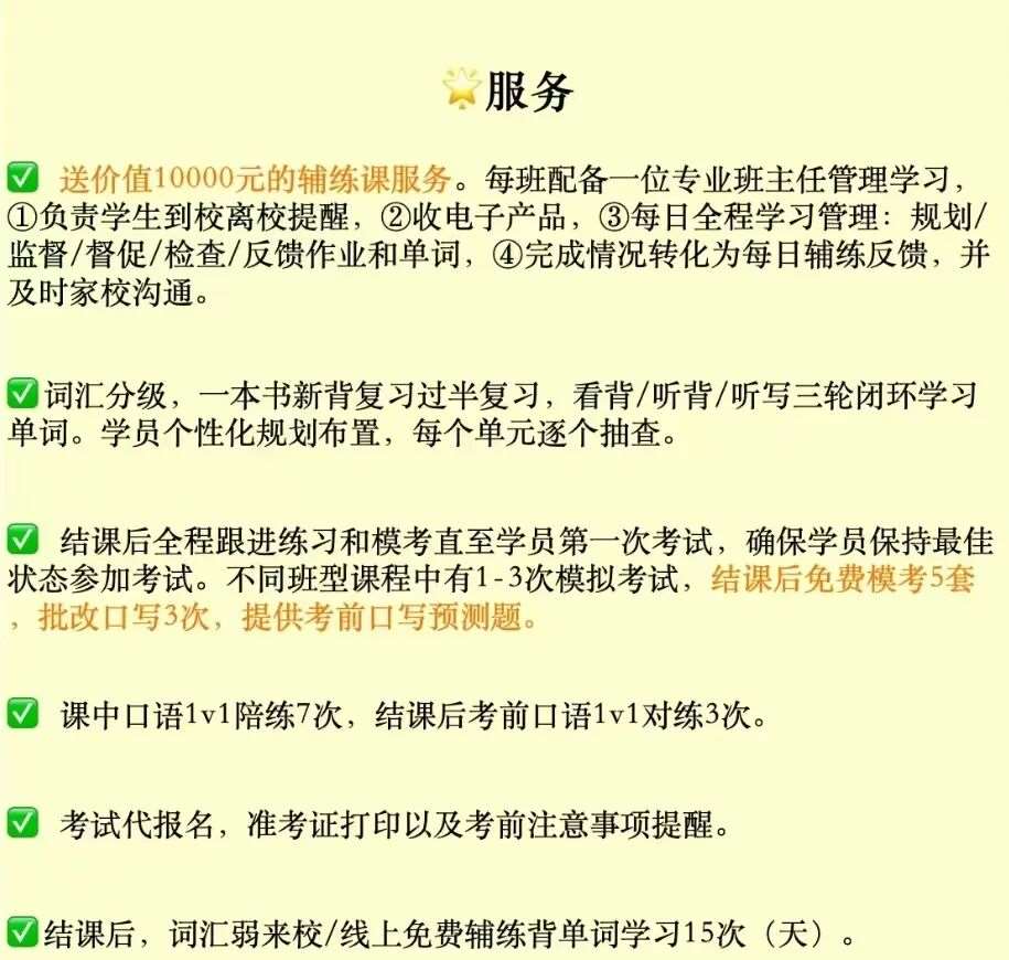 按照蒲公英的教学管理模式:一个班15天,每天10小时 ,300个单词 +300个复习,针对性的课堂和课后练习,以及考前5天的5套的实战模考,每个周期大概200个小时。