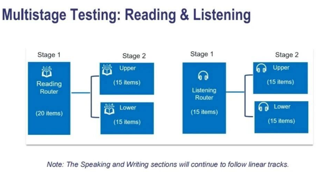 注意:阅读、听力为自适应考试,整体分为 2 个部分 —— 第一部分为固定基础难度,考生该部分的答题表现,直接决定第二部分的难度层级(分为 upper 高难度、lower 低难度);最终得分并非只看正确率,会结合题目数量、题目难度综合核算。