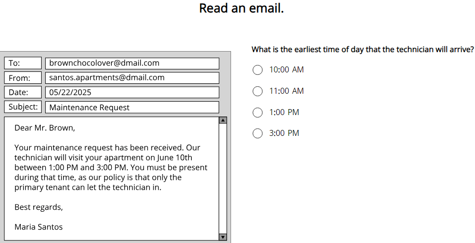 新增题型:回复问题(Listen and Response) ✅ 考查形式:极简题型设计,1 句场景提问 + 1 道对应选择题,场景均为日常生活高频场景,贴近实际沟通 ✅ 核心考点:快速捕捉听力关键信息,精准匹配符合语境的应答内容 新增题型:短对话(Listen to a Conversation) ✅ 考查形式:生活交流场景音频,时长约 30 秒,每段对话配套 2 道单选题,聚焦日常沟通场景 ✅ 核心考点:听懂日常对话逻辑,抓取核心交流信息,分辨对话关键细节