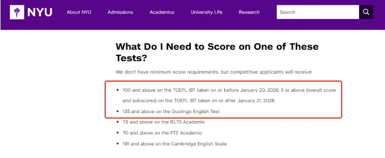 (纽约大学官网2026年新版托福*要求)