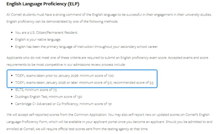 康奈尔大学率先发布了针对2026年秋季入学的英语水平要求,明确调整了对新旧托福考试的*标准。此举很可能成为2027年申请季各大学校的重要参考。