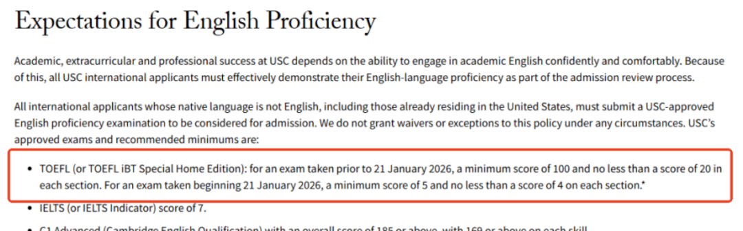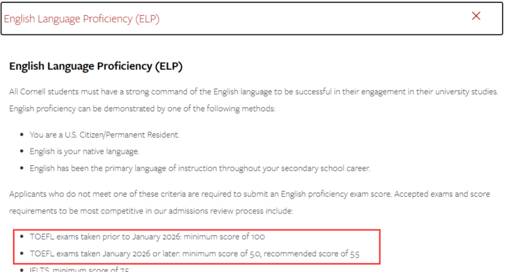 旧版托福(2026 年 1 月前考试):*低录取分数 100 分 新版托福(2026 年 1 月及之后考试):*低要求 5.0 分,建议申请者达到 5.5 分(对应旧版托福 106-113 分),以提升竞争力 其他语言*替代选项:雅思 7.5 分及以上;多邻国 130 分及以上;剑桥英语 C1/C2 191 分及以上