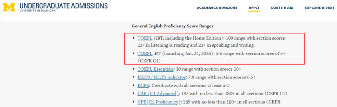 作为常春藤中明确新托福分数换算标准的院校,其要求具有较强的参考意义: