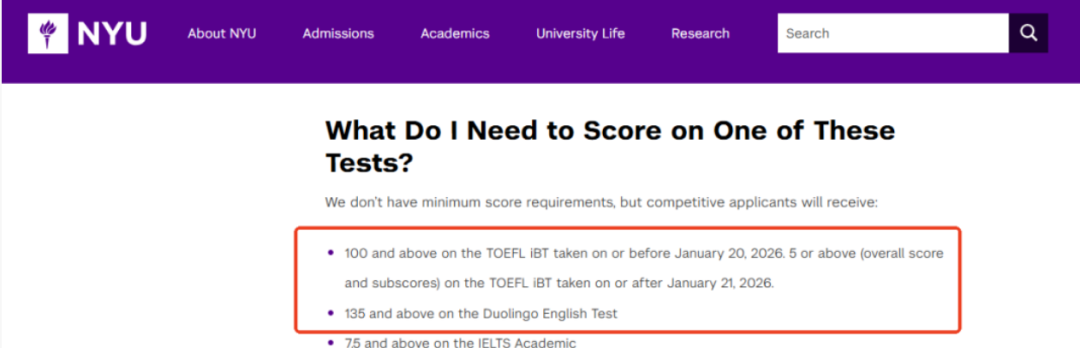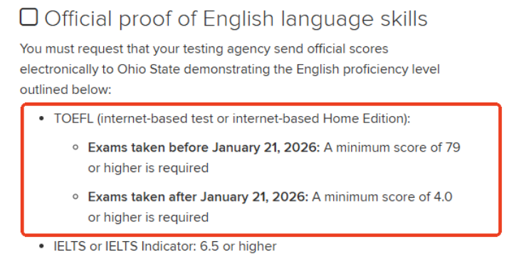 旧版托福:总分不低于 100 分 新版托福(2026 年 1 月 21 日后考试):总分及听说读写单项均需达到 5 分及以上(根据 ETS 官方换算标准,新版 5 分对应旧版 95-105 分区间) 其他语言要求:雅思 7.5 分及以上;多邻国 135 分及以上;PTE 70 分及以上;剑桥及以上