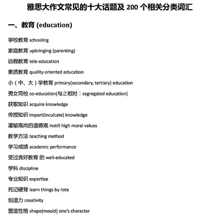 为了帮大家高效攻克词汇难关,我们整理了雅思作文常见十大话题及200个相关分类词汇。