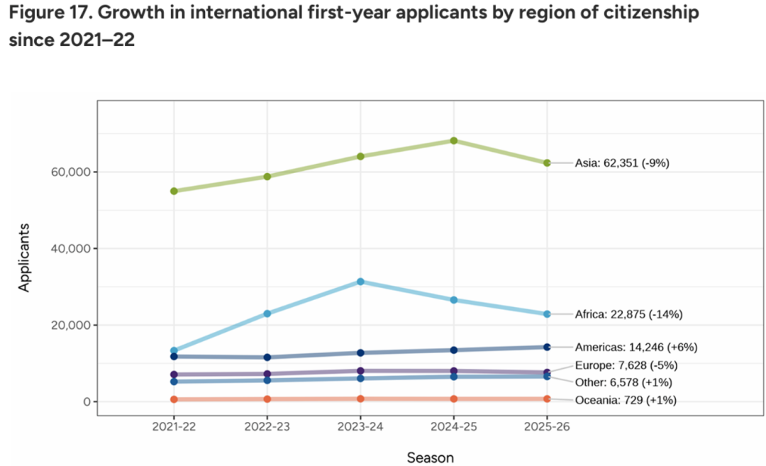 分地区来看,国际生群体的回落幅度存在明显差异:非洲地区申请者降幅*大,达到 14%;亚洲地区申请者降幅约 9%;欧洲地区申请者降幅约 5%。