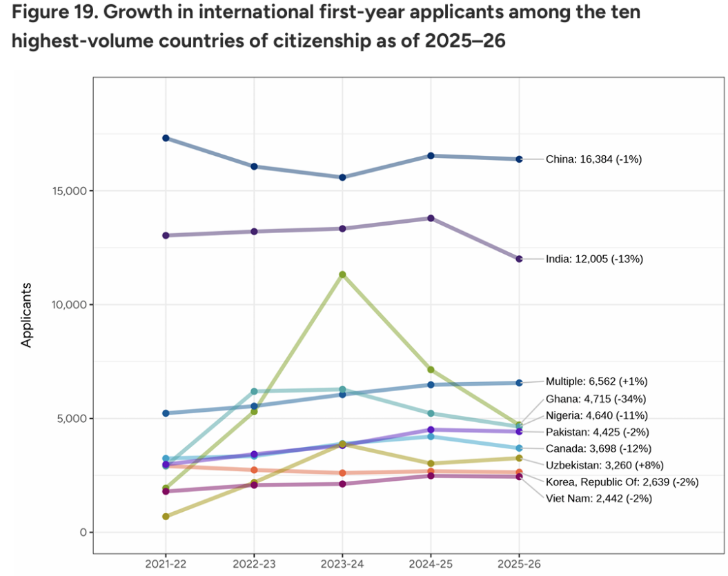 在此背景下,中国申请者的表现尤为突出:截至 2026 年 1 月 1 日,中国申请者人数约 16,384 人,同比仅小幅回落 1%,依旧是美国本科院校*大的国际生源国。