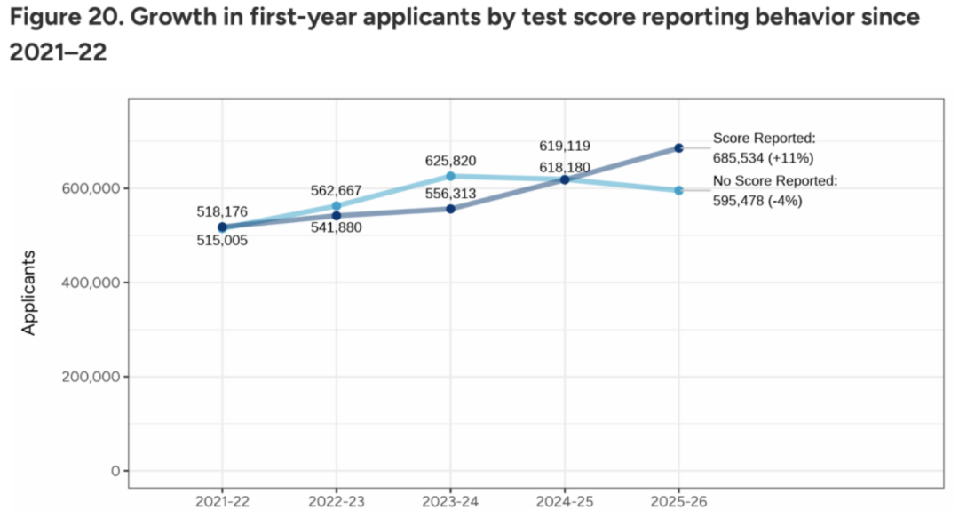 数据直接打脸 “标化无用论”:26fall 提交标化的申请者飙到 68.5 万 +,同比暴涨 11%;没提交的反而降了 4%!
