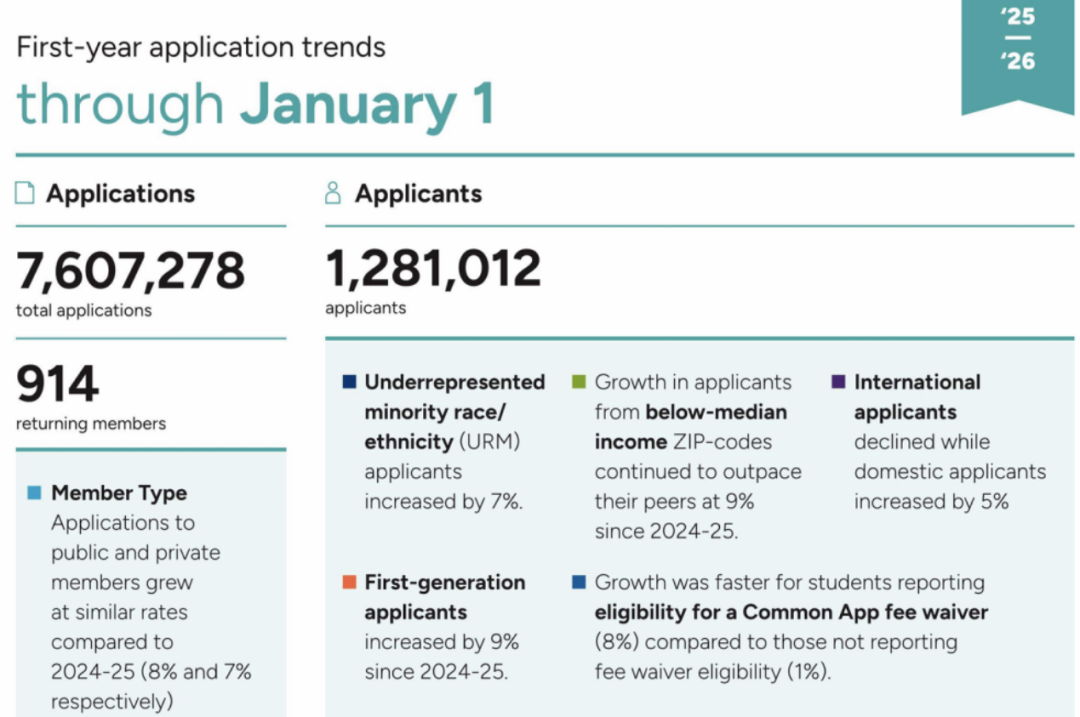 根据 Common App 最新发布的 2026 Fall 阶段性申请数据(统计截至 2026 年 1 月 1 日),本申请季累计申请人数达1,281,012 人,提交新生申请总量7,607,278 份;