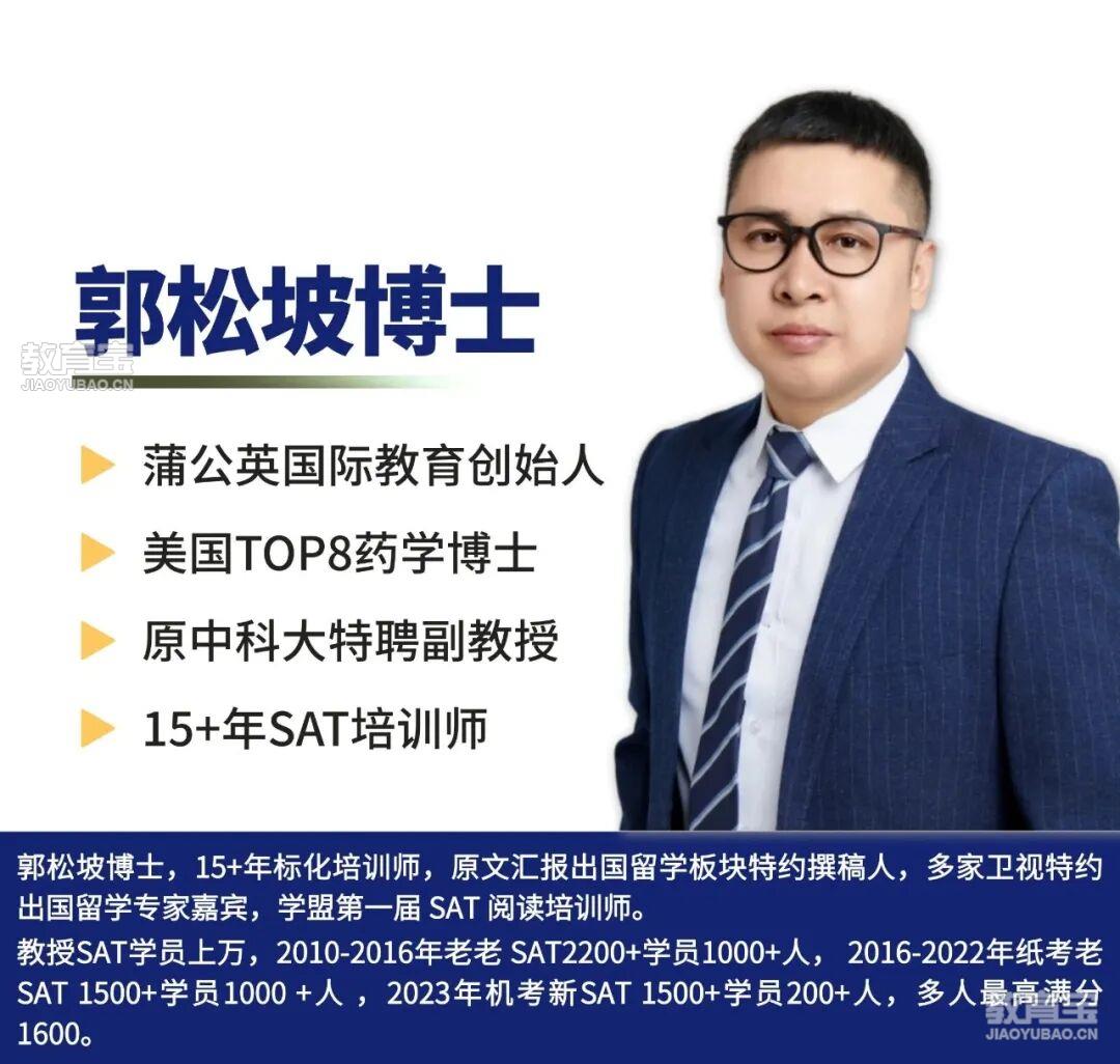 拥有15年+SAT培训经验的郭博士,对命题规律、出题套路了如指掌,总结的技巧精准高效,带出无数高分学员,助力众多学子圆梦理想院校。