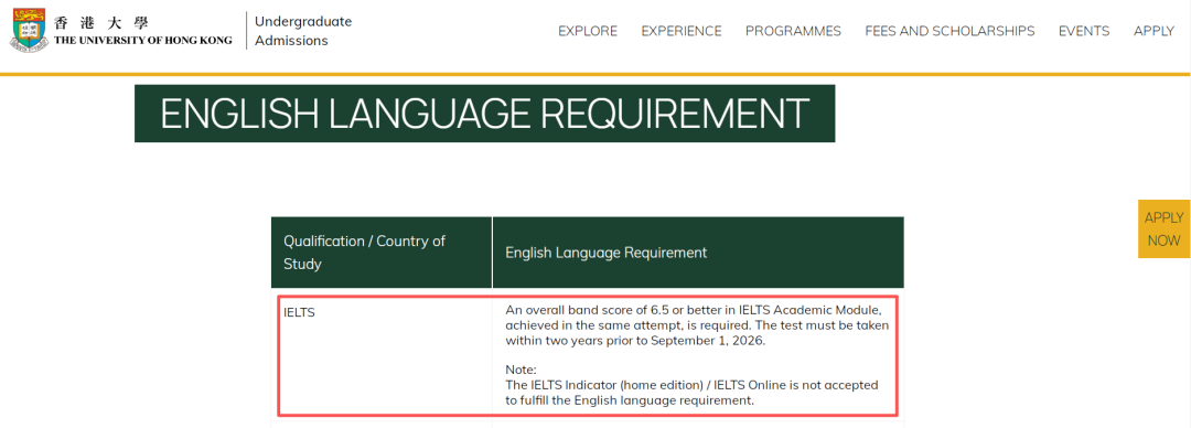 雅思*(IELTS Academic)要求总分至少6.5; 考试*必须是在2026年9月1日前的两年内完成的同一次考试*才有效; 不接受Indicator/Online/One Skill Retake等替代*。