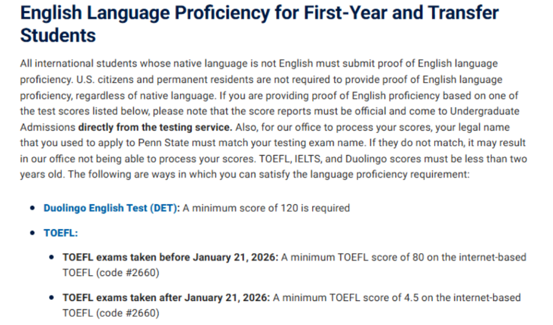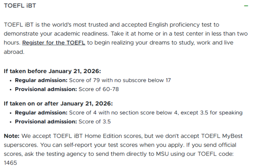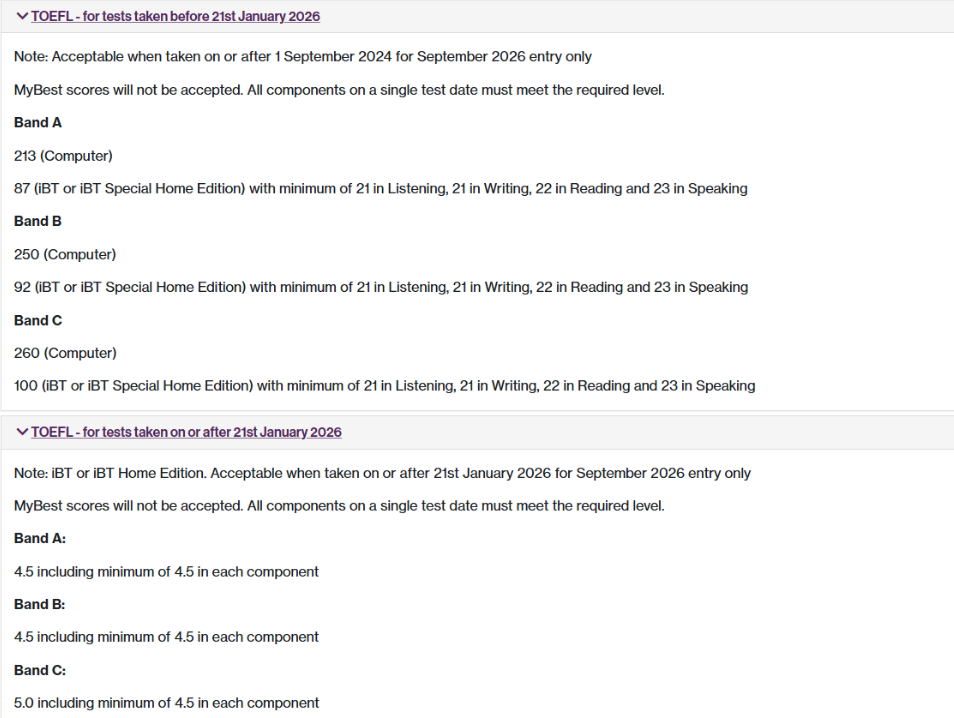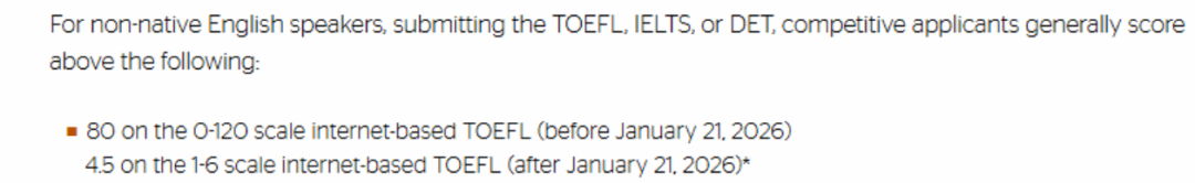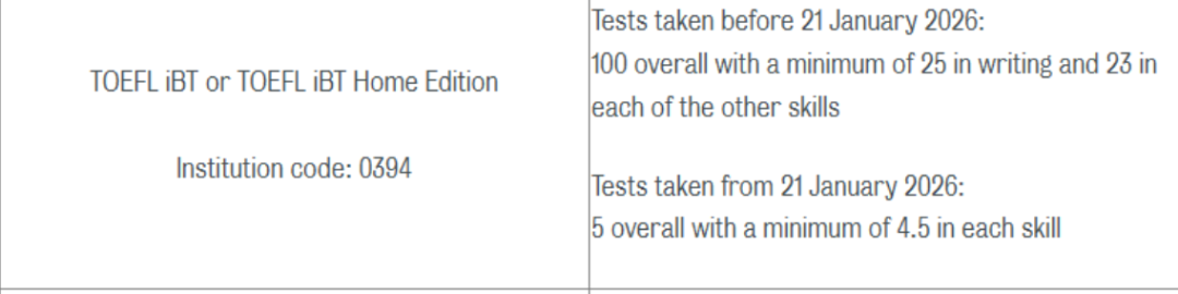 📅2026.1.21 及以后(新托福):总分*低 4 分,单项均不低于 4 分,口语单科*低 3.5 分