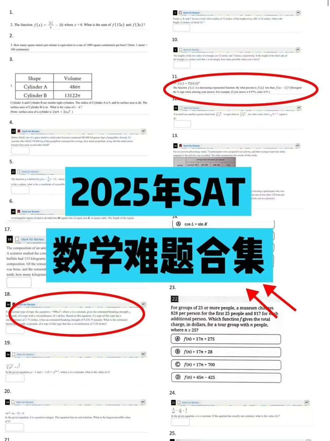 为了帮助同学们在考前用*短时间攻克,蒲公英SAT教研组整理了2025年全年《SAT备考数学真题难题》,专门针对Hard Module易错题、高频陷阱题、多次复现难题整理,帮你精准突破780+、冲击800分!