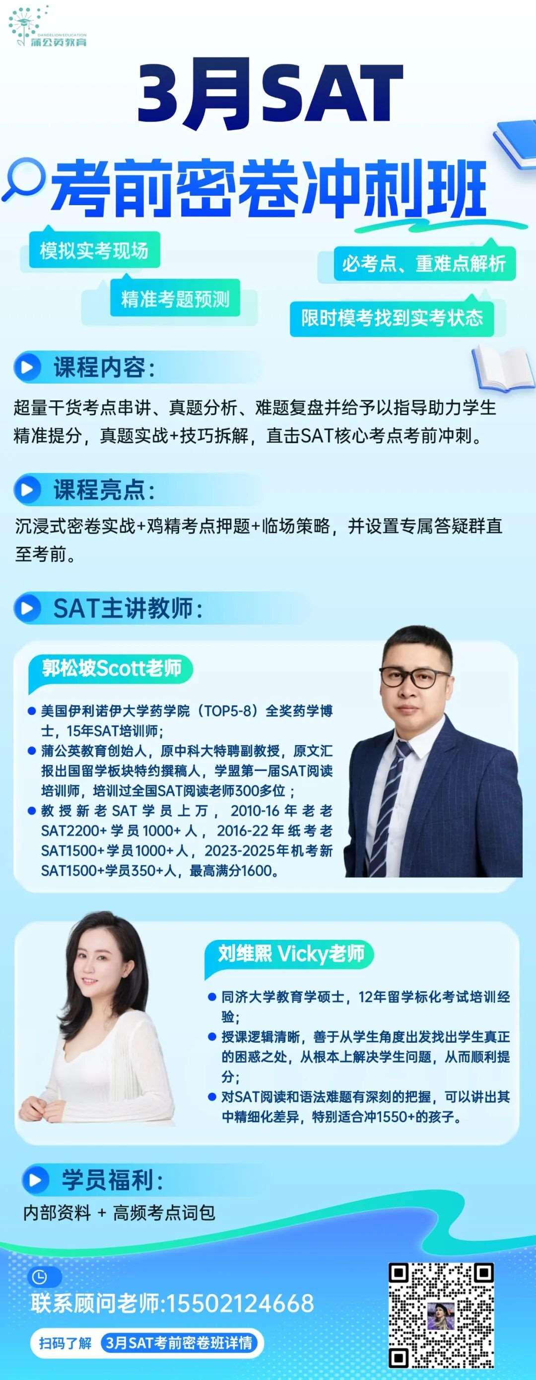 重磅课程!3月SAT考前密卷班,15年标化大神,带你冲刺SAT1550+分!