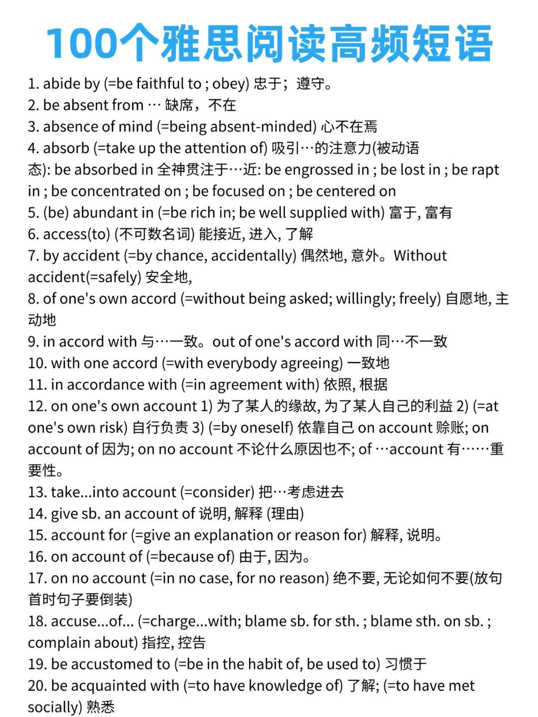 今天给大家分享100个雅思阅读高频短语,这份资料里的短语大多来自来自雅思历年真题,覆盖考试中常见的固定搭配和逻辑表达。