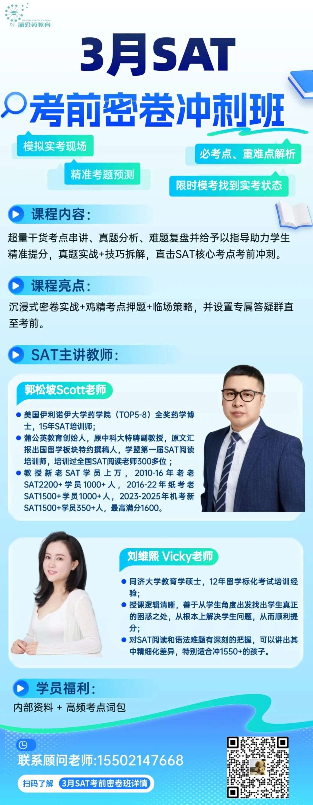 蒲公英教育的3月SAT考前密卷班,通过沉浸式密卷实战、精准考点押题和临场策略指导,帮助考生快速提升应试能力。同时,学员还能享受内部资料和高频考点词包等福利,并有专属答疑群全程陪伴,直至考前。