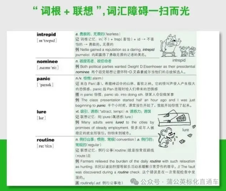它不是简单罗列单词,而是用词根词缀拆解+趣味联想记忆,比如把spect(看)相关的spectator、inspect、prospect打包记忆,再配上生动的联想梗,让单词不再是孤立的字母组合,背一个顶一串。