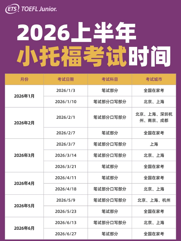 准备让娃冲刺小托福的家长们看过来!2026上半年小托福考试时间表,考位、科目、城市一次梳理清楚,有需要的家长快快码住~