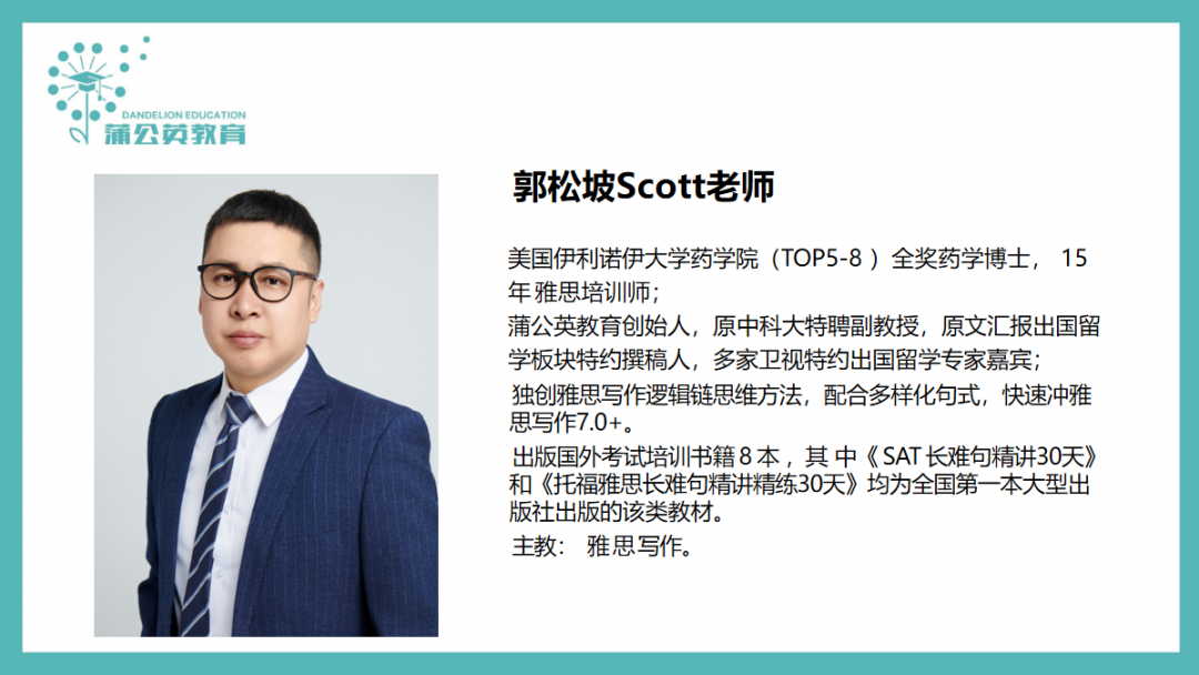 我们的核心底气来自顶配师资天团由留美 全奖药学博士、15 年标化授课经验的郭博士亲自带队,他是业内公认的标化大神,独创雅思写作逻辑链法,出版多本经典备考书籍。