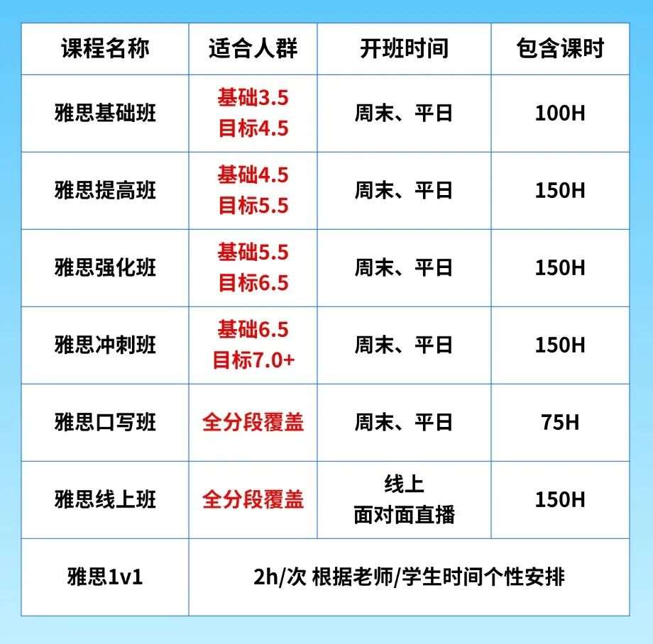 我们摒弃大班课粗放模式,主打3-8 人精品小班制,并提供灵活 1V1 定制,针对不同基础、不同目标的学生,设计了 6大核心班型,精准匹配你的备考需求。