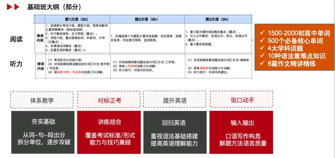 后期冲刺阶段,针对听力、阅读、口语、写作四大模块进行重点强化训练,传授考试技巧。