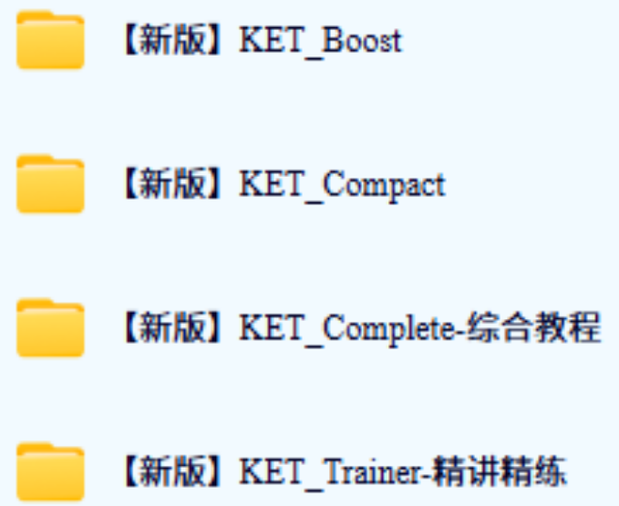 KET考试备考资料包,KET教材都包含了新版的KET提升教材、综合教材和精讲精练。这些教材可以帮助小朋友系统地学习KET考试内容,搭建学习基础。
