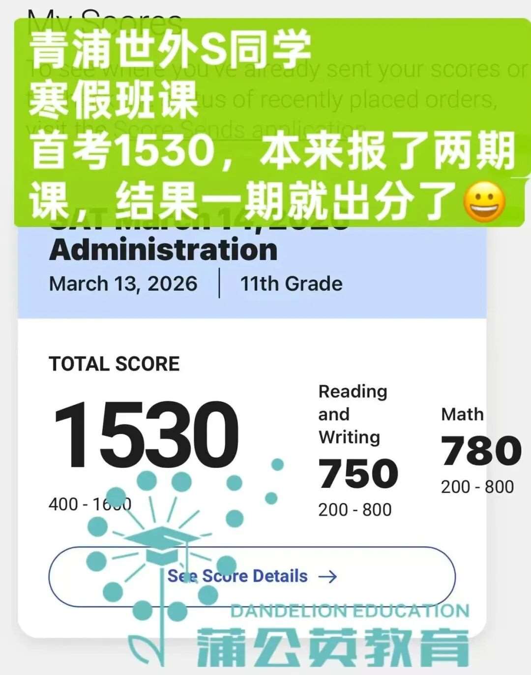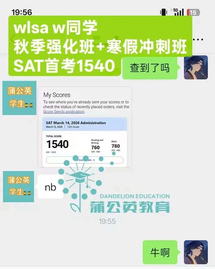 3月SAT出分热潮来袭,上海蒲公英教育再迎高分狂潮,一众学员斩获亮眼佳绩,喜报接连不断~✨ 速来接住学霸欧气,沾满高分好运,下一个圆梦高分的就是你!🎁上海蒲公英教育学霸爆款SAT暑期课程火热抢占名额中,深耕考点、靶向、全程带练,帮你轻松拿下SAT1500+wlsa W同学,秋季强化班+寒假冲刺班首考SAT1540分