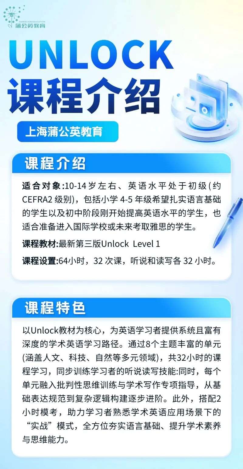*上海蒲公英教育:2026年Unlock备考课程培训,解锁孩子英语学术成长新可能
