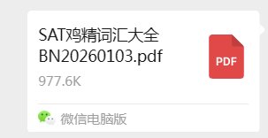 2026年准备SAT考试的学子,先别着急,首先需要清晰的SAT考试时间、准确的报考信息以及规划科学的备考方法,今天一文说清2026年SAT考试全攻略!附上海蒲公英郭博士SAT词汇鸡精pdf,减少单词痛苦~欢迎关注我们,文末有郭博士SAT词汇鸡精pdf领取!根据College Board官网公告,2026年全年共安排8场SAT机考,上半年3场已开放报名,下半年5场时间也已确定,SAT关键报名节点一定要记牢!*出分时间约为考后10-14天,需按照个人申请规划安排科学考试时间。2026年SAT仍为全机考形式,考试时长约2小时15分钟,总分1600分,分为“阅读与文法”和“数学”两大板块,采用多阶段自适应模式(MST),题目难度会根据你的答题表现动态调整,具体情况如下:题量/时长:54题,65分钟(分2个模块,各27题)核心考察:信息与观点、结构与修辞、表达与思路、标准英语规范。题量/时长:44题,70分钟(分2个模块,各22题)核心考察:代数、高等数学、数据分析、几何与三角函数,可使用计算器(自带合规机型或内置Desmos计算器)。两个科目的第*个模块难度适中,你在第*个模块的答题表现会决定第二个模块的题目难度,难度会相应调整为更高或更低,进入更高难度模块的同学总分上限会更高。合理规划、灵活分配作答时间,遇到难题及时标记跳过。同一模块内可自由跳转、回看修改,切勿在单题过度纠结,浪费宝贵时间。阅读、写作板块养成勾画关键信息、随手笔记的习惯;选择题善用排除法快速缩小答案范围,放平心态,不过度纠结题目难度。数学科目提前熟悉机考内置计算器操作;多参加全真模考,适应机考界面、操作流程与各项功能,消除上机陌生感。认真复盘模考报告,结合官方模拟题与课程资料,精准定位薄弱题型和知识盲区,集中专项训练,逐个突破难点。考前保证充足睡眠,考试当日合理饮食、提前抵达考场;保持平稳心态,放松情绪,从容自信应战。完整版资料扫码回复【SAT鸡精】领取